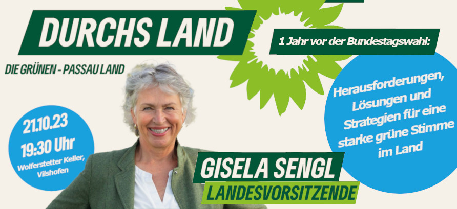 Gisela Sengl, Vorsitzender der Bayerischen GRÜNEN, kommt nach Passau. Auf einer öffentlichen Veranstaltung wird sie unter anderem erläutern, wie wir GRÜNEN bei der Bundestagswahl aufholen wollen.