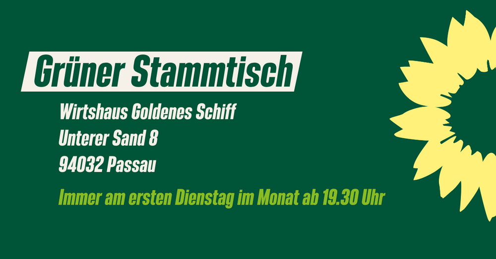 Der Grüne Stammtisch für Passau-Stadt und Passau-Land findet immer am ersten Dienstag im Monat statt. Treffpunkt ist das Gasthaus "Goldenes Schiff".