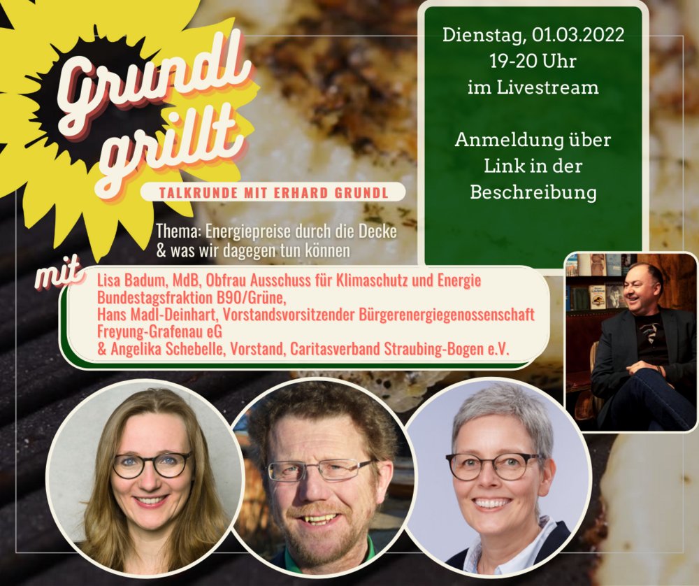 Das erste „Grundl grillt“ im neuen Jahr: Am Dienstag, 1. März, grille ich ab 19 Uhr wieder. Diesmal zu einem Thema, das gerade alle beschäftigt: Energiepreise durch die Decke & was wir dagegen tun können. Wer sind die Preistreiber? Welchen Effekt haben dabei Erneuerbare Energien? Und was bedeutet die Preisspirale für Menschen mit geringen Einkommen?