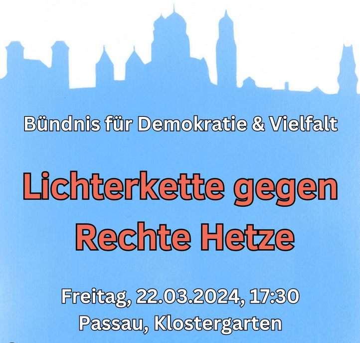 Am Freitag, 22. März, findet ab 17.30 Uhr eine Kundgebung am Klostergarten statt. Von dort aus ziehen die Demonstranten dann weiter zum Ludwigsplatz, wo sie sich in Richtung Donau und Inn aufteilen, um sich dann an der Ortspitze wieder zusammenzuschließen und eine große Lichterkette zu bilden.