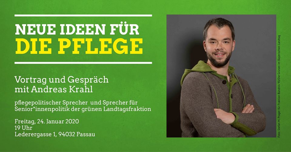 Andreas Krahl, pflegepolitischer Sprecher und Sprecher für Senior*innenpolitk der grünen Landtagsfraktion, ist zu Besuch in Passau und stellt in seinem Vortrag zukunftsfähige Konzepte für die Pflege vor. Anschließend steht er für Fragen und Diskussionen über die Herausforderungen im Pflegebereich zur Verfügung.