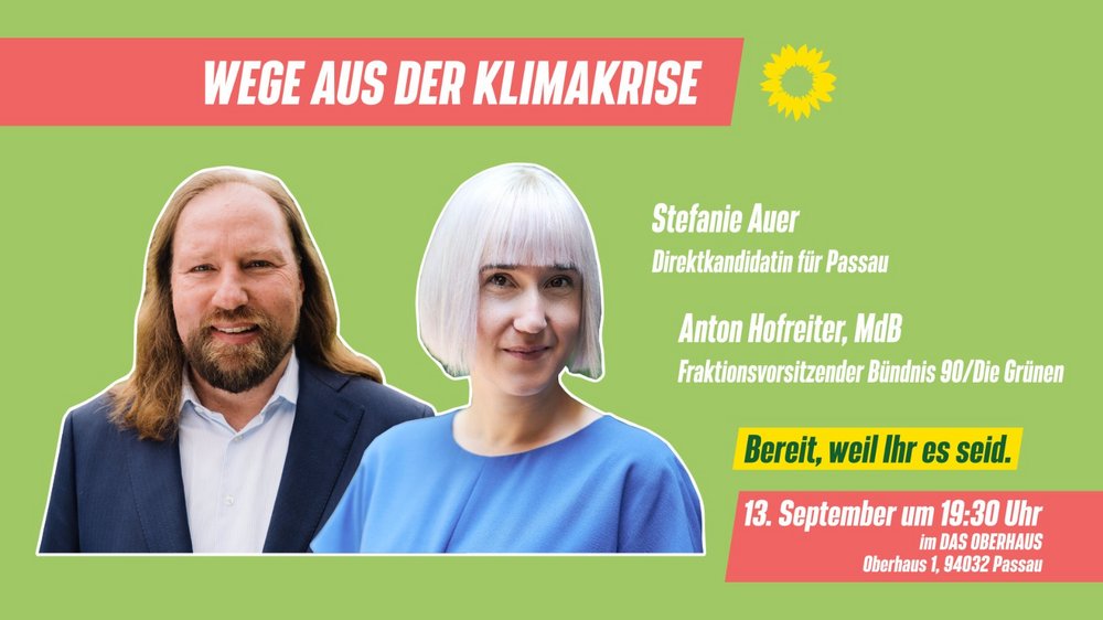 Unser Fraktionsvorsitzender im Bundestag Anton Hofreiter kommt auf seiner Sommertour nach Passau. Er wird am Montag, 13. September ab 19.30 Uhr gemeinsam mit unserer Bundestagskandidatin und Fraktionsvorsitzenden im Passauer Stadtrat Stefanie Auer über Wege aus der Klimakrise diskutieren.