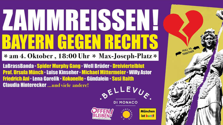 Mittwoch, 4. Oktober 2023, 18:00 Uhr Kundgebung auf dem Max-Joseph-Platz in München unter dem Titel „Zammreißen! – Bayern gegen Rechts“