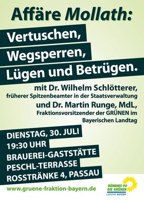 In unserer Veranstaltung in Passau skizzieren und kommentieren Wilhelm Schlötterer und Martin Runge die Geschehnisse in der "Causa Mollath". Anschließend werden mögliche bzw. notwendige Schritte in der Justiz und in der Politik diskutiert. Besprochen werden sollen auch etwaige strukturelle Defizite bei der Bekämpfung von Schwarzgelddelikten und Steuerbetrug sowie Defizite im Maßregelvollzug und auf dem Weg dorthin.