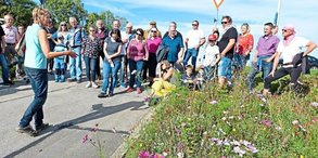 Hartmann schilderte am Halt an einer herrlich blühenden "Bienenweide", die der Gartenbauverein Neukirchen am Inn angelegt hatte, die Bedeutung von Blühflächen für Insekten. Der Gartenbauverein habe das Artenschutz-Volksbegehren zum Anlass genommen, etwas für Heuschrecken, Hummeln, Schmetterlinge und Wildbienen zu tun, deren Bestand dramatisch zurückgeht.