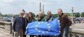 "Eine Woche vor der Europawahl besuchen wir Freunde in Paris und feierten die deutsch-französische Freundschaft. Mehr als 70 Jahre Frieden, nach zwei verheerenden Weltkriegen. NIE WIEDER unser Slogan, so haben wir an verschiedenen Stellen in Paris immer wieder unsere Europafahne ausgepackt und Fotos gemacht, quasi als Erinnerung an die umstehenden Leute, unbedingt zur Wahl zu gehen. Zu unserer Freude haben sich auch andere Menschen spontan die Fahne von uns ausgeliehen und Fotos gemacht. Europa verbindet. unser Europaprojekt, deutsch-französische Freundschaft."